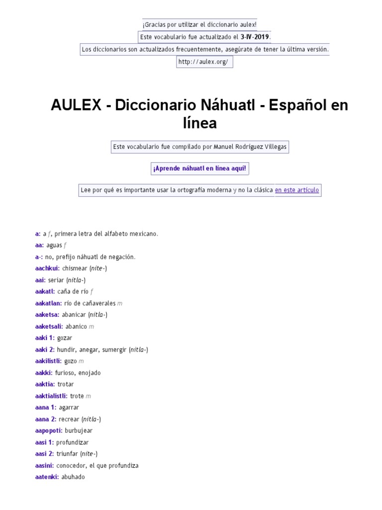 NO SE REQUIERE DE INTERNET UTILIZA EL DICCIONARIO EN DONDE QUIERA QUE ESTS. Traduzca de espaol a nhuatl o nhuatl a espaol. Diccionario nhuatl-espaol en lnea para autodidactas Aulex con ms de once mil entradas y una versin para descargar.
