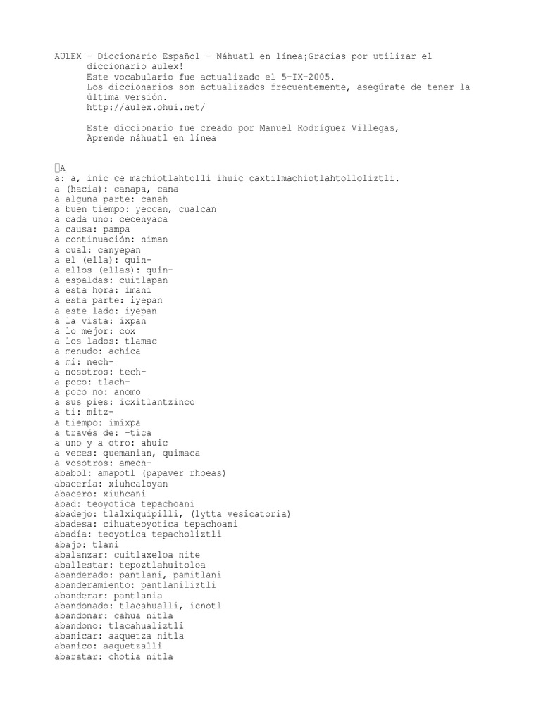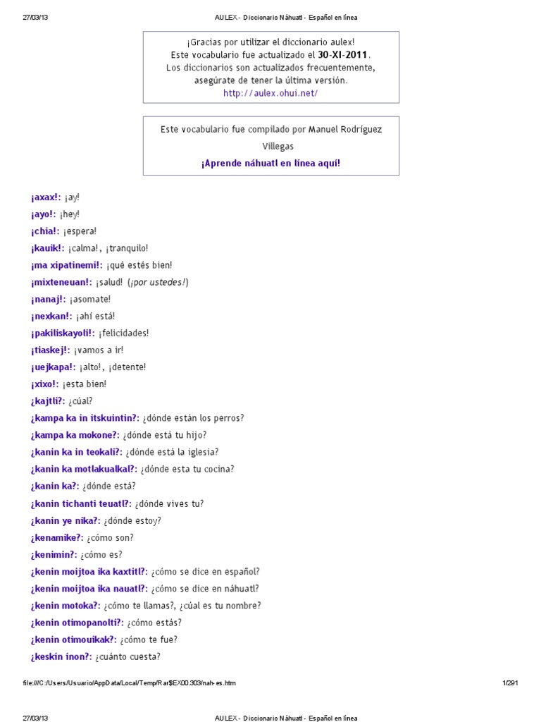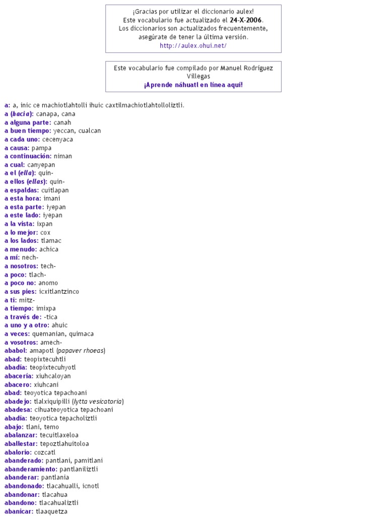 Traductor espaol-nhuatl con voz. Descargue gratuitamente el Software de Traduccin _languag de Babylon. Traducciones voz Aadir. Este vocabulario fue compilado por Manuel Rodrguez Villegas Aprende nhuatl en lnea aqu.
